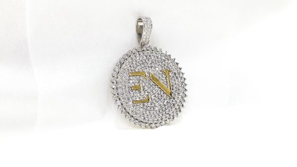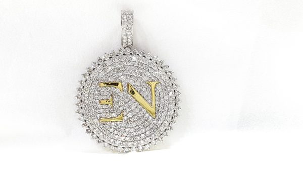 - This 18k White Gold Diamond Initial EN Pendant Weighs approximately 32.00 Grams And Features 10.80 Carats of Sparkling Natural Round Diamonds. This Diamond Initial Letters Can Be Customized Any Letters. Any Letter is Available, But Gram Weighs And Diamond Carat Weight May Vary Depending on the Letter. This 2.00 Inch Pendant is made of 18Kt or 14 kt Yellow gold of Natural White diamonds . This piece is handcrafted and manufactured by Parasmani. All of the Diamonds are Hand-Set by a Master Diamond Setter in the Highest Quality Craftsmanship. This Piece is Made of Solid White Gold.