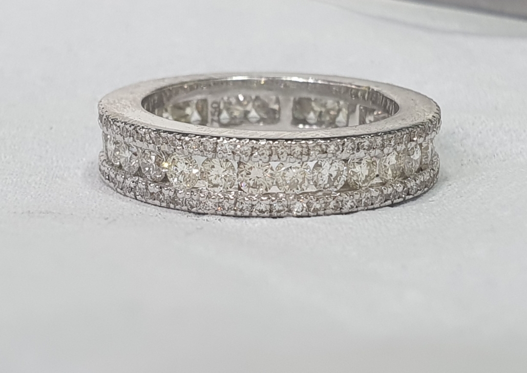 This 18k white gold wedding band is a timeless style band that pairs great with most engagement rings. the polished white gold channel setting holds a row of diamonds consisting of 2.13 carat total weight & 18 Kt White Gold Weight 7.21 Grms a beautiful wedding band to unify your love.